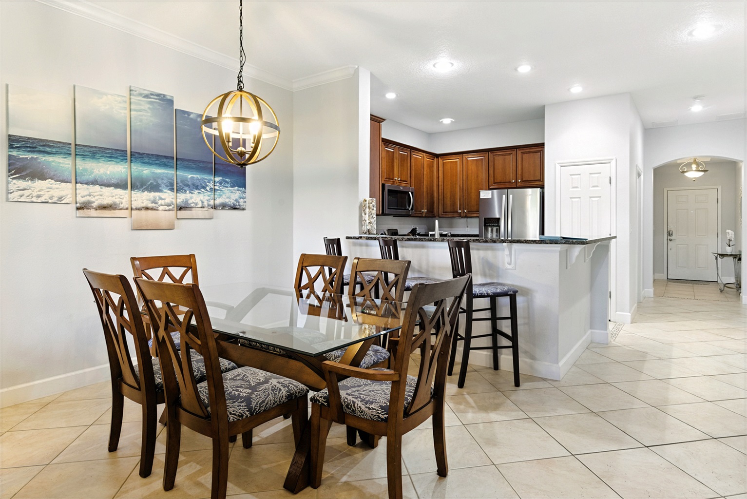 The Chef’s Kitchen: Outfitted with granite countertops, stainless steel appliances, and every tool needed for a gourmet meal at the 6-person dining table.